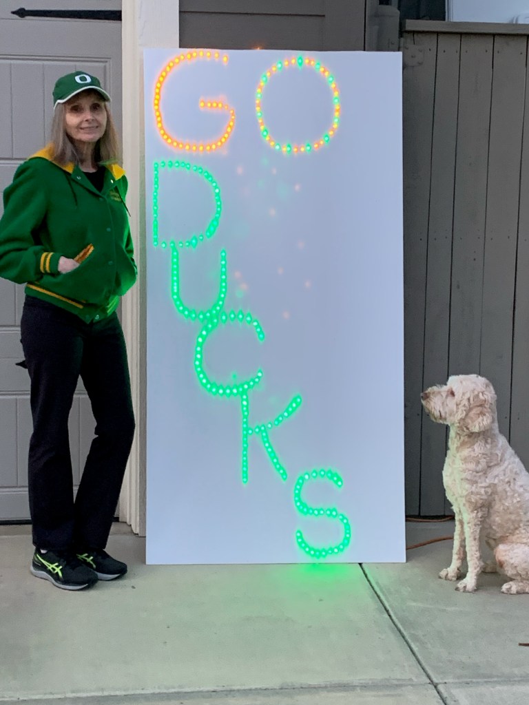 We were anxious to get back from the dog walk, and we looked forward to snacking on the famous Harry and David’s pepper and onion dip that was chilling in the fridge, waiting to be paired with the giant bowl of potato chips on the counter. The decision had already been made—we would throw caution to the wind and just give sodium the middle finger that day. On the way out the door, we flipped on the garage switch to light up the custom six-foot sign I made, which was proudly positioned and standing tall in the driveway. It read “GO DUCKS” and was magnificent! It was early, but you could already see the glow of the green and yellow Christmas lights shining brightly in the fading light of day (yellow LED lights are HARD to find). The game was taping, just in case . . . thanks, DVR!