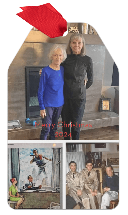 When I realized the package had arrived at Jim’s house, I exclaimed, “Yeeesss, it’s there!” I called Jim and he answered the phone right away. He was sitting in his favorite cozy chair in the living room, and I could tell he was admiring the ornament like a cherished memory. It was revealing when he sighed sentimentally. “You know,” he said, pausing, “I look at the Window Washer picture every day, and now it’s even more special to me.” Jim was wonderstruck with this new treasure, flipping it from front to back and back to front while holding it in the well-worn hands of a dedicated artist and bronze wildlife sculptor. The eighty-eight-year-old man was both flabbergasted and nostalgic at the same time. Rhetorically, he asked, “How did all those photos fit on that one ornament?” He was amazed at how I even added the photo his daughter had sent to me of Rockwell, Jim, and his buddy sitting around and relaxing. Jim was movie star handsome, that’s for sure! His voice lit up and he continued, “I haven’t seen that photo of me and Rockwell in a looong time!”
