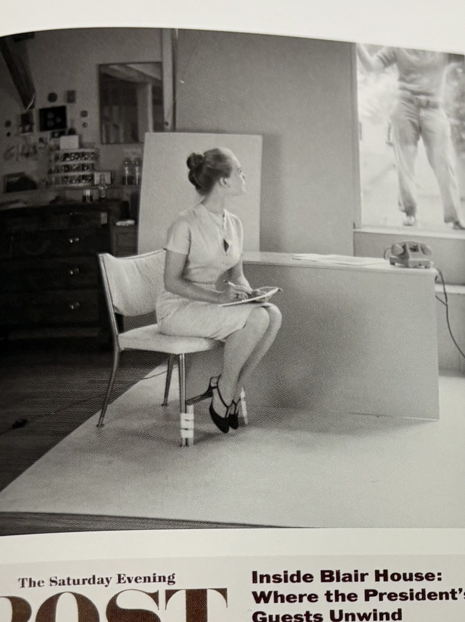 When Nan brought an armload of dresses back to the studio, Rockwell didn’t like any of the choices. Instead, she ended up wearing her own green dress and shoes from her closet at home for the model sitting. In the final painting, Rockwell lowered the neckline of the dress and added straps to her shoes, as well as a bar across the bottom of her chair. Adding the bar would make it appear as if the secretary’s knees were being held up and her feet perched on a bar that never actually existed. To this day, Nan is quite proud of her athleticism and the fact that, even though there was no actual bar for her to place her feet on, her abs of steel held her knees up just fine! After all, Nan had been a gymnast, cheerleader, and infamous water skier who would drop both skis in the process of climbing up the legs and backside of Felix, a high school classmate, and end up sitting on his shoulders—the pair were quite the entertainment as they tootled around the lake. She was NO fluffy secretary!